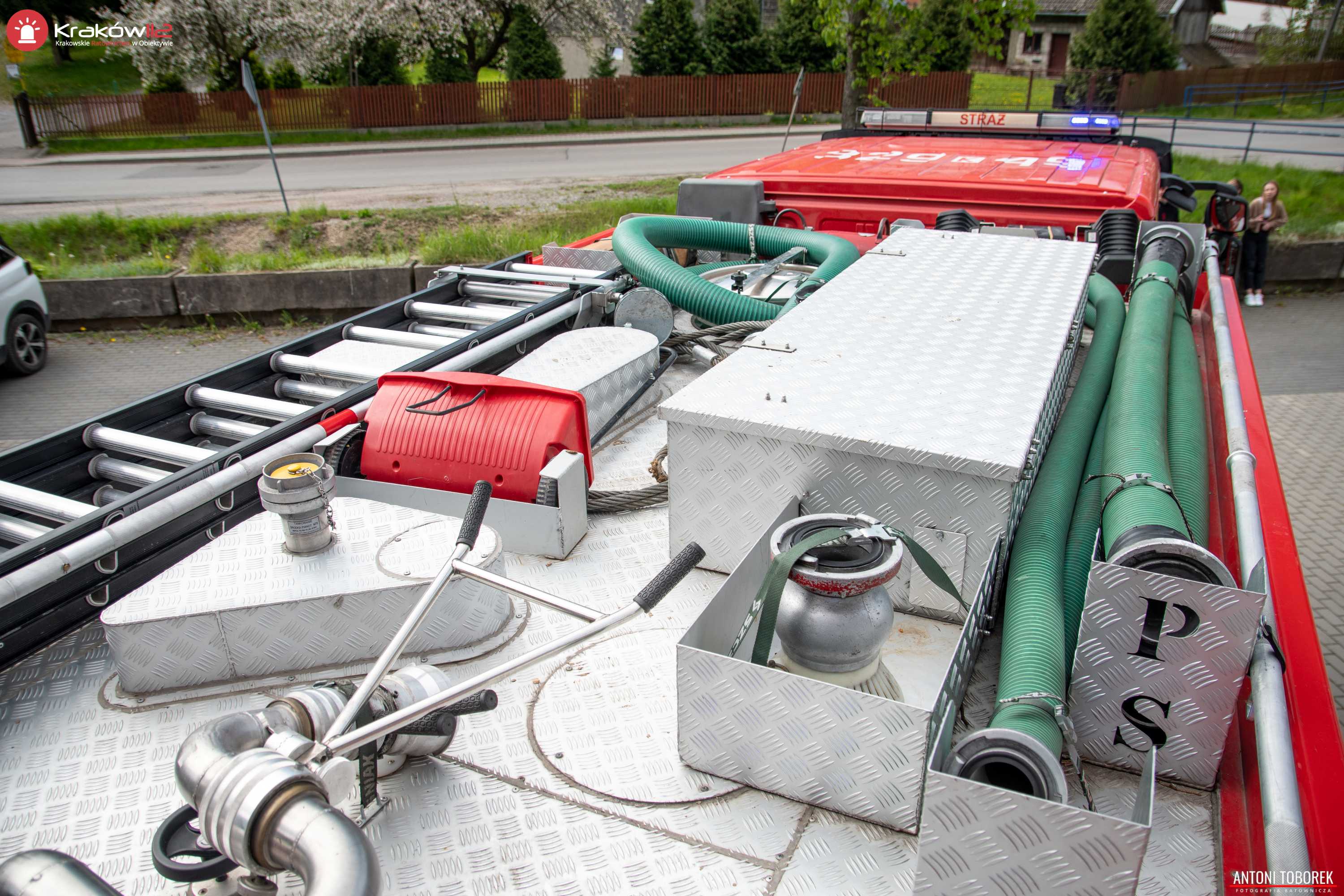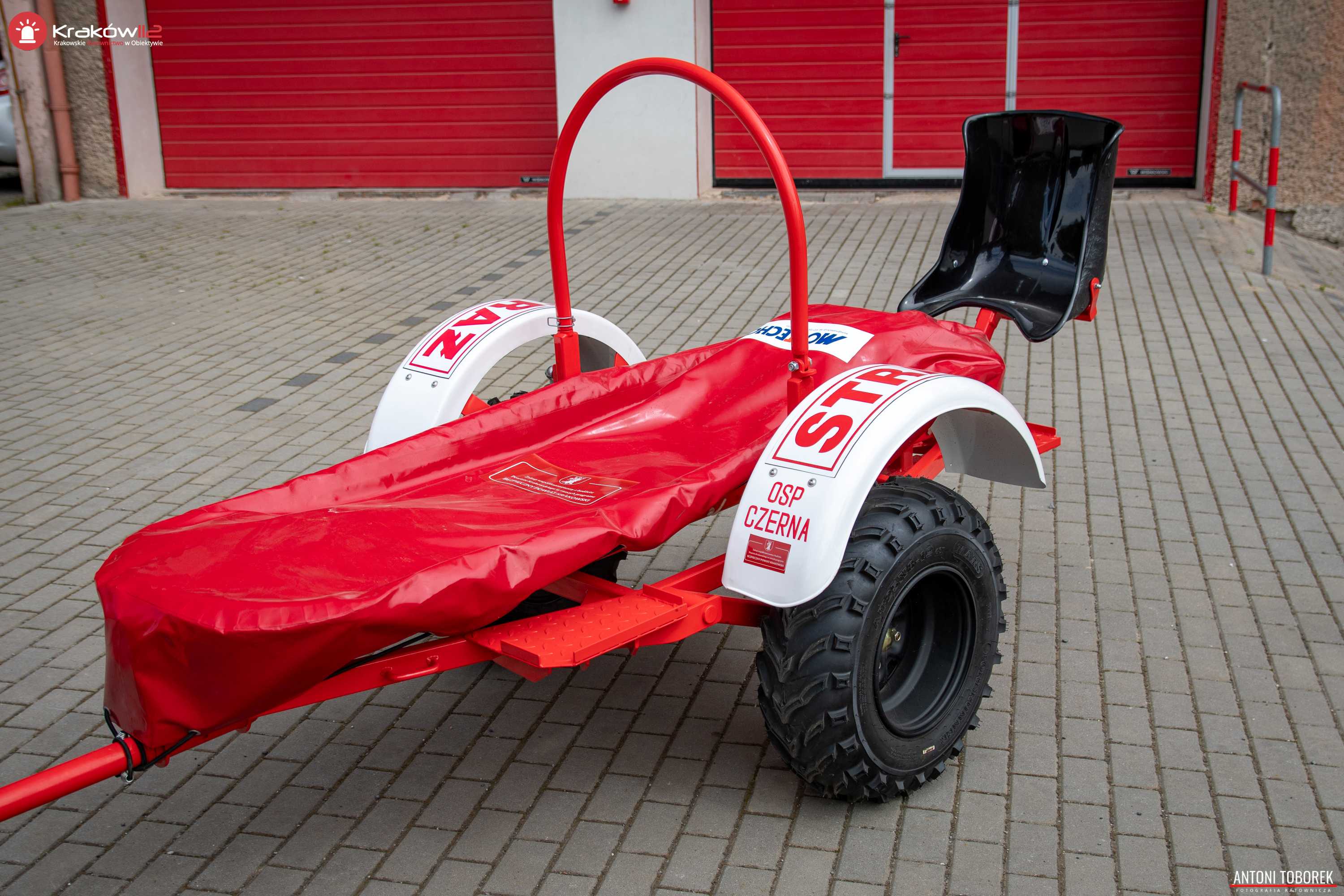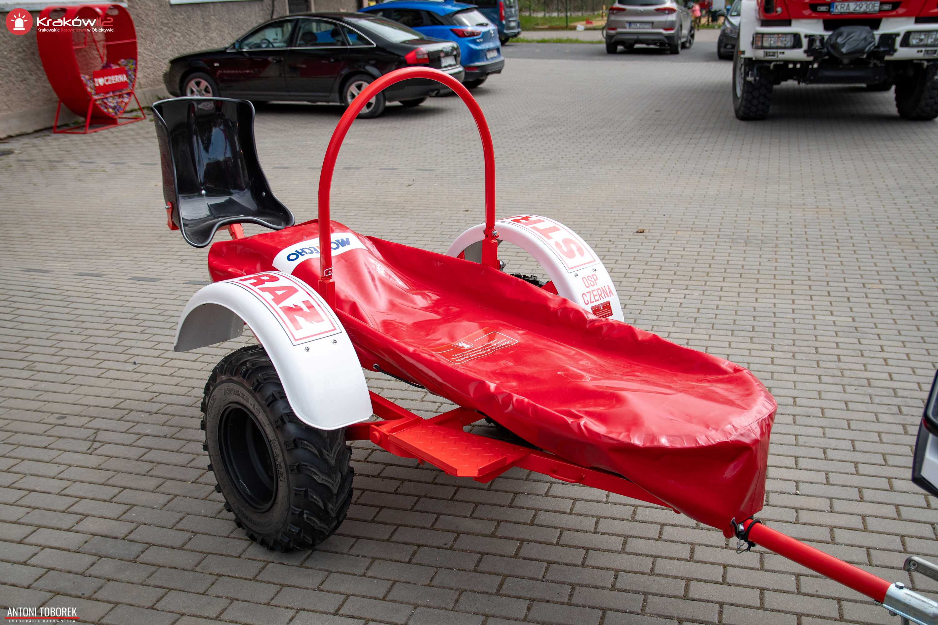 Przyczepka została pozyskana w 2020 roku w ramach Małopolskiej Tarczy Antykryzysowej. Na jej wyposażeniu znajduje się m.in: namiot stelażowy, 10 łóżek, 10 śpiworów, 10 krzeseł, stolik, nagrzewnica olejowa, agregat prądotwórczy, sprzęt oświetleniowy i inne akcesoria.Zdjęcia OSP: